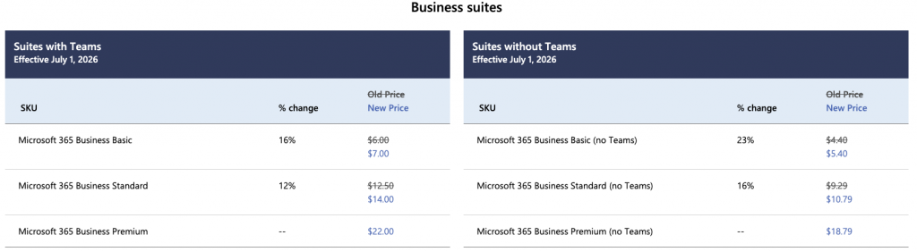 If you’re on the Teams-excluded versions, Business Basic without Teams moves from $4.40 to $5.40 per user monthly, a 23% increase. Business Standard without Teams goes from $9.29 to $10.79, a 16% jump!