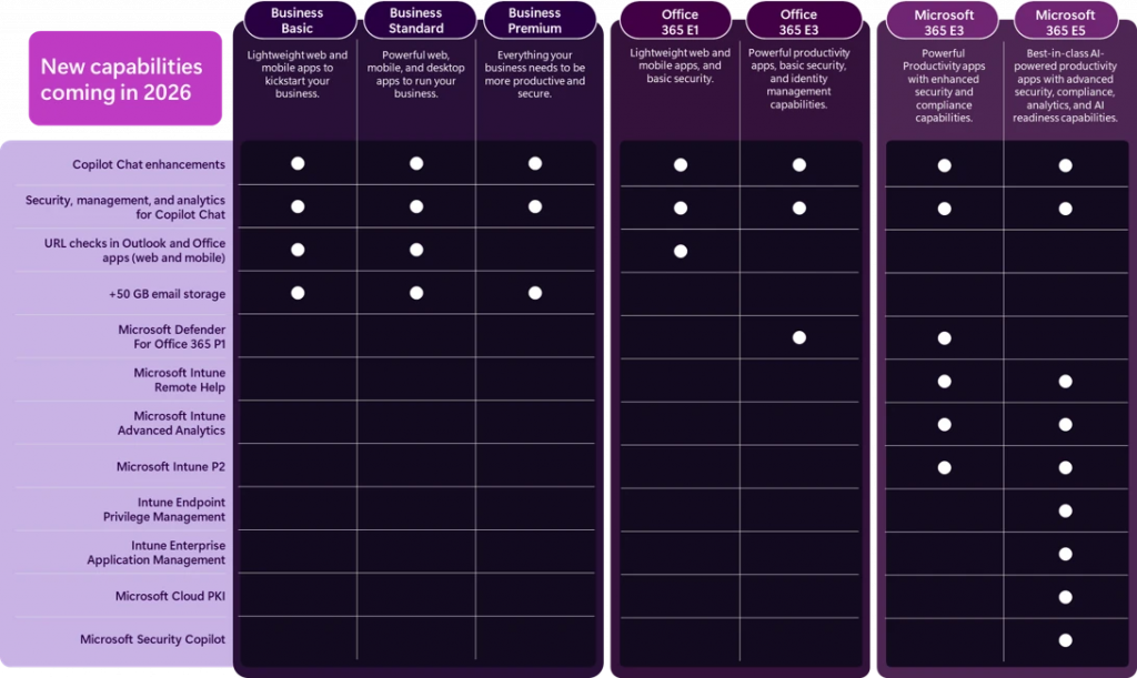 Business Basic and Business Standard customers are getting an additional 50GB of email storage, URL time-of-click protection, Copilot Chat enhancements, and Copilot Chat Analytics rolling out in summer 2026.